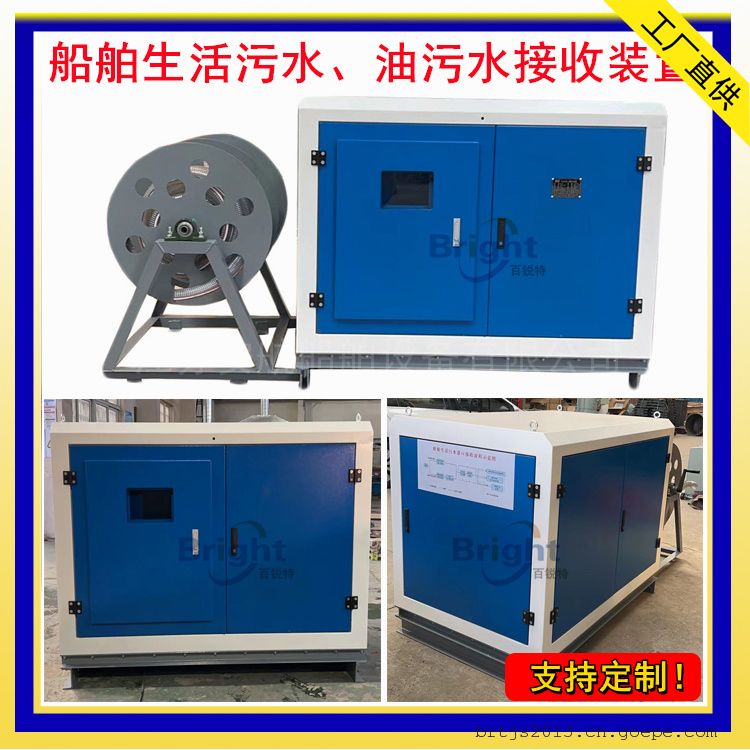 本产品为船用污水岸上智能接收装置,该装置由底座、外壳、粉碎自吸泵、阀、控制箱、手动卷管架、水箱等组成,分固定式和移动式两种。